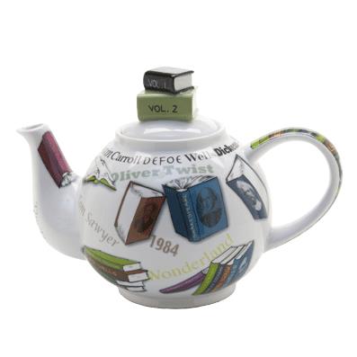 Als leidenschaftliche Teetrinkerin – egal ob Rooibos, Schwarztee mit Kandis und Sahne, grüner Tee oder Honeybuschtee – stöbere ich immer auf verschiedenen Webseiten nach neuen Teesorten und auch nach schönen Tee-Accessoires. Dieses Mal bin ich bei FB auf etwas aufmerksam geworden und habe mir auch mal die Seite des Shops angeschaut. Zugegeben sie ist etwas teuer, aber sie sieht sehr gut aus: die literarische Teekanne von “Die Buch Bar”. Sie fasst 1,4 Liter Tee – nach Angaben des Shops sind dies ca. sechs Tassen -, ist aus Keramik und spülmaschinenfest sowie geschirrspülergeeignet. Ob und wann ich dieses Schmuckstück erstehen werde kann ich noch nicht sagen, da es hier schon einige Teekannen für meinen Teegenuss und -verbrauch gibt. Aber schön ist sie mit den Buchtiteln und Autorennamen: