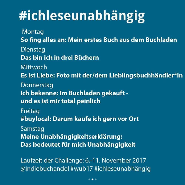 Daher Grund genug für mich an der Woche der unabhängigen Buchhandlungen zu beteiligen, die am 04. November startet. Vielleicht habt ihr ja auch eine inhabergeführte Buchhandlung, die an der Aktion mit macht, schaut doch mal hier nach, ob sie mit dabei ist.